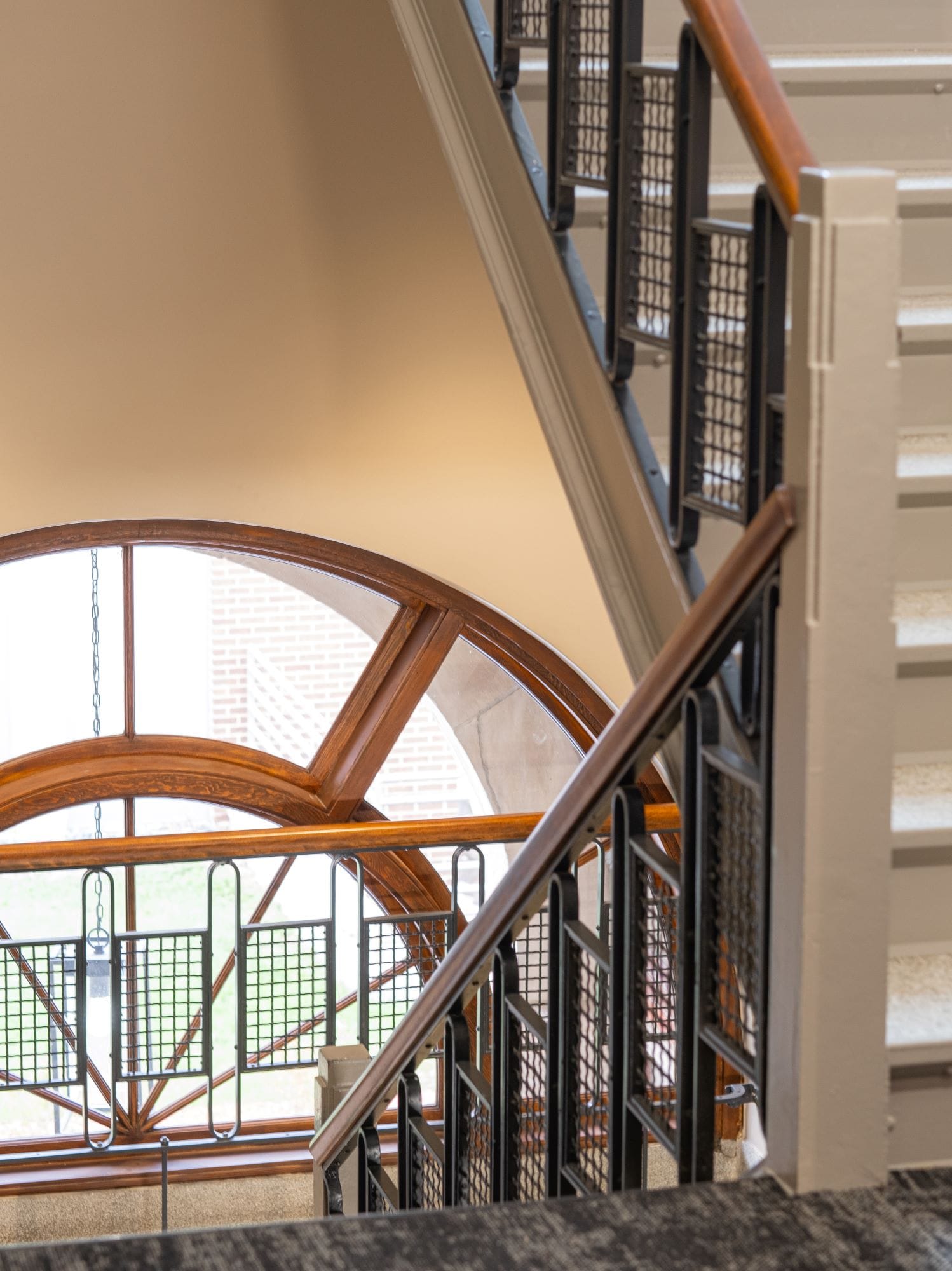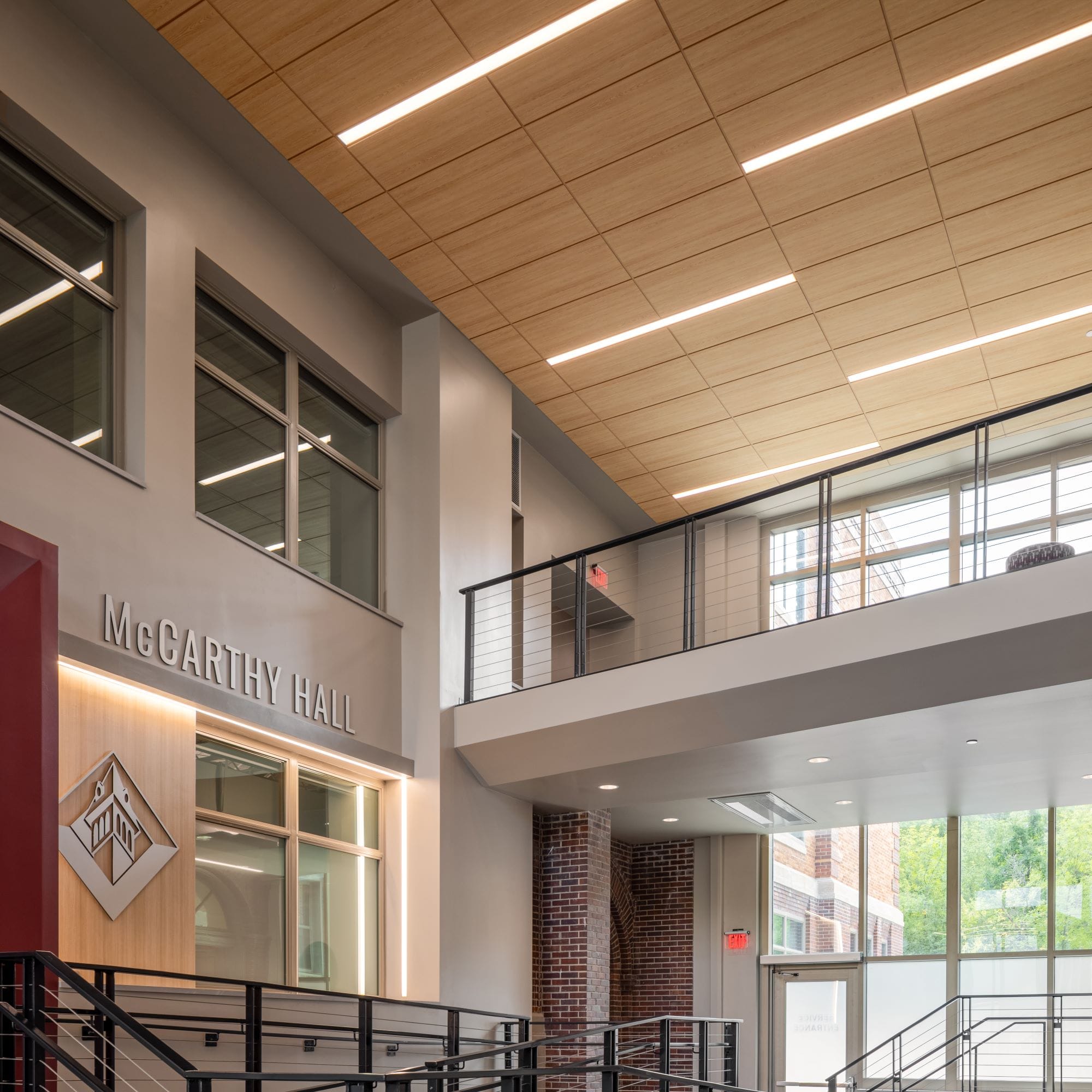 McCarthy Hall carries structural significance as the first campus building to use prefabricated steel joists, a method that only became widespread in the 1930s. The renovation celebrates this innovation by exposing the original floor structure. The building’s rare metal lathe ceilings add visual texture and acoustic benefits, while the upper level’s exposed wood ceilings bring warmth to contemporary learning spaces.