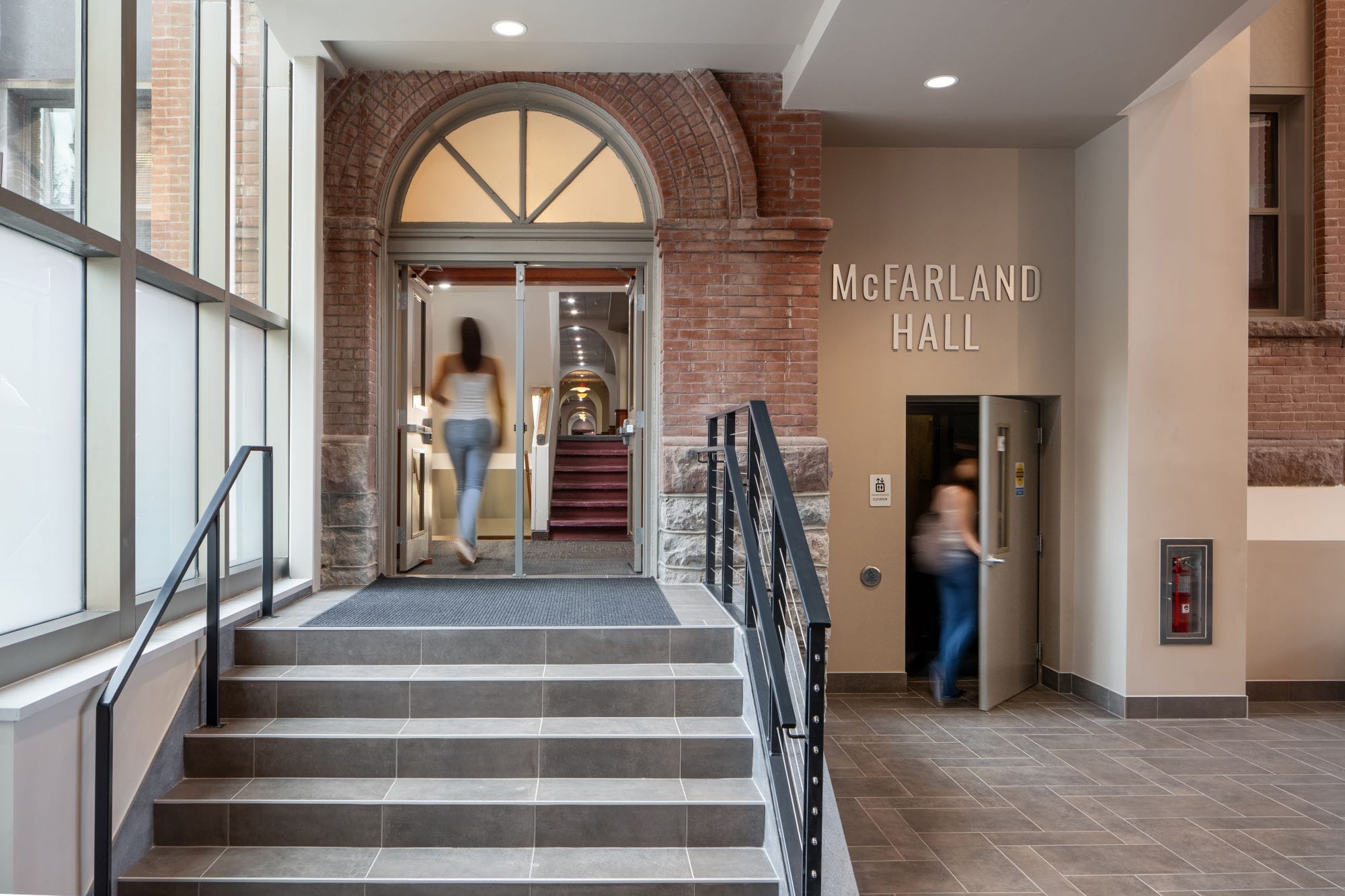 The 2025 renovation restores McCarthy Hall’s presence while respecting its historic neighbors. A new glass atrium between McCarthy and McFarland creates a welcoming entrance, improves circulation and accessibility, and reestablishes McCarthy’s prominence on the campus mall. Restored full-height windows now flood interiors with daylight, while exterior brick tuckpointing, stone cleaning, and fresh finishes revive the building’s historic charm. Historic materials were salvaged and integrated into the renovation, including wood-paneled doors from a former observation room, now repurposed as an accent wall in the main conference room. The original arched brick openings connecting McCarthy to McFarland are preserved and highlighted in the atrium lobby, blending past and present.