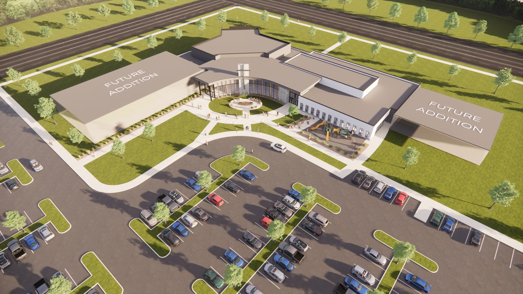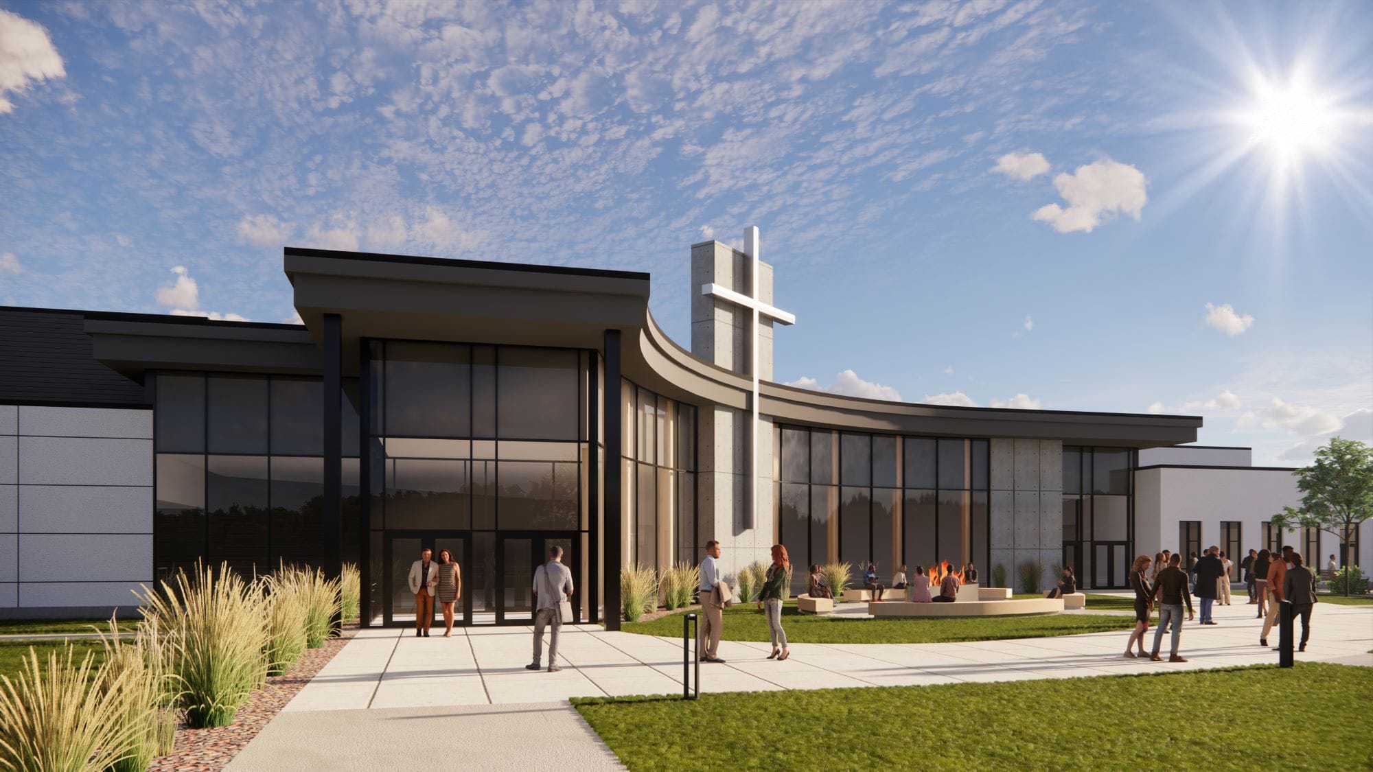 Foss guided the predesign for a new church in Horace designed to support both worship and community gathering. The building includes a sanctuary, kids’ sanctuary, classrooms, indoor and outdoor playgrounds, lobby, coffee shop café, and office spaces. A curved glass lobby floods the interior with natural light and creates a visual connection to an outdoor patio, fostering a welcoming environment for congregating. A prominent cross anchors the building and aligns with the outdoor gathering space and vehicle drop-off, establishing a clear spiritual and visual axis throughout the site.