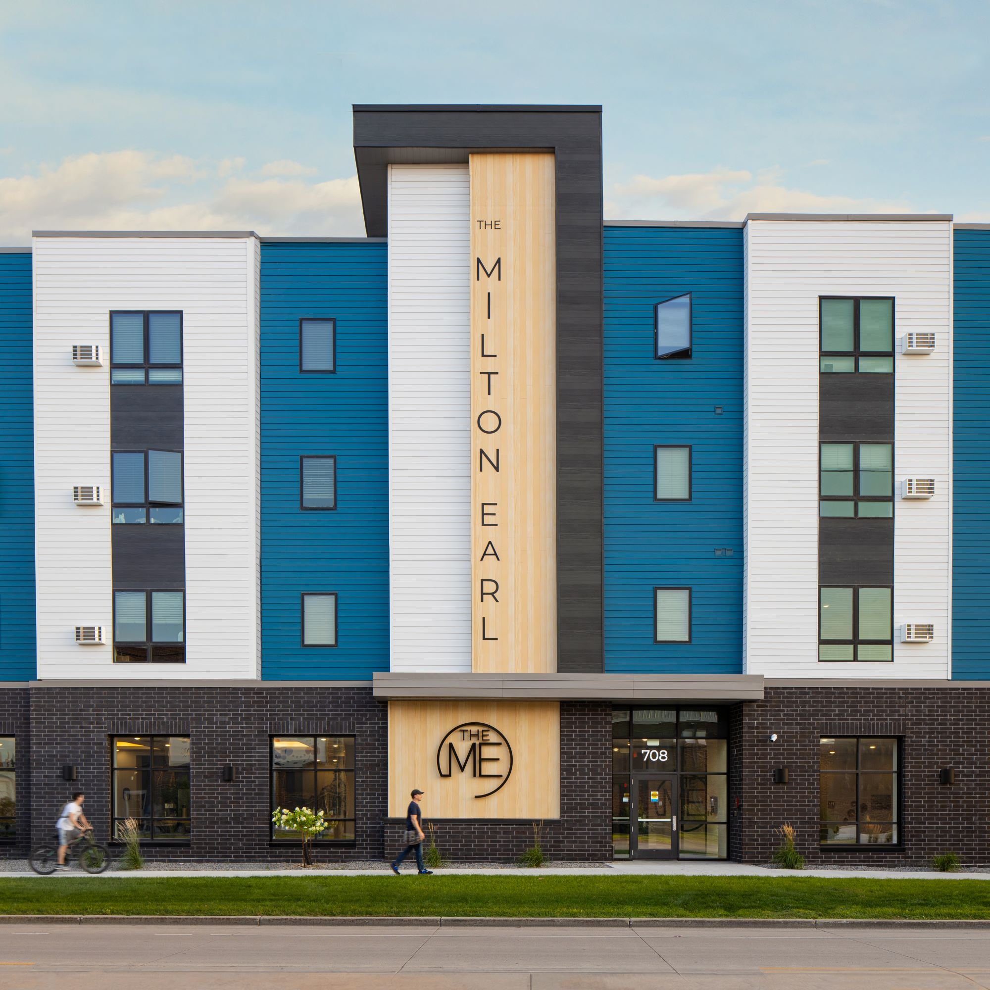 The southwest corner of the Milton Earl apartments tapers down to a single story to be sensitive in scale to the 6 historic homes in the M.E. Beebe Historic District, which are listed on the National Register of Historic Places. The new Milton Earl apartments are named in honor of Milton Earl Beebe, who was an American architect of the late 19th and early 20th centuries. Milton Earl Beebe once resided on this block and designed several banks, schools, courthouses, and other civic architecture–many of which are listed on the National Register of Historic Places.